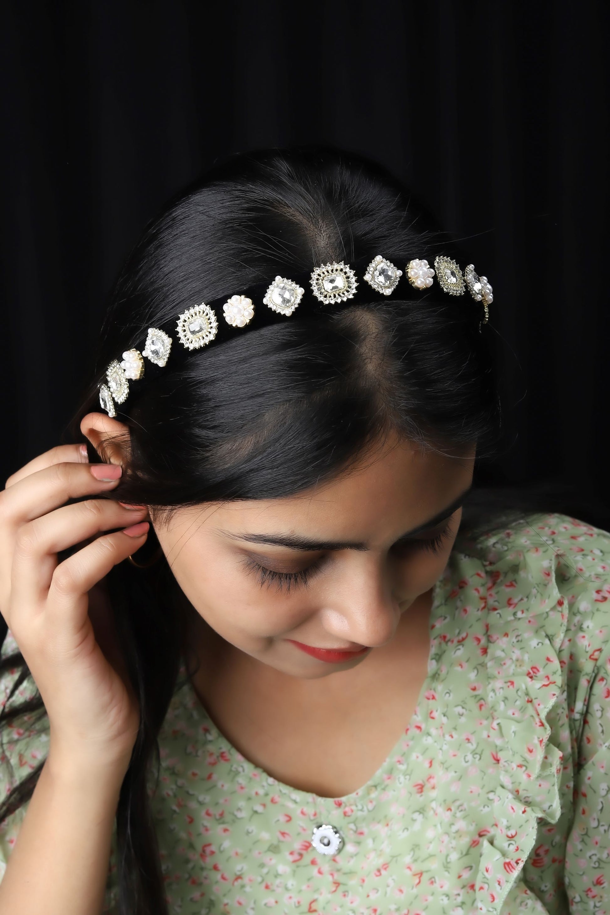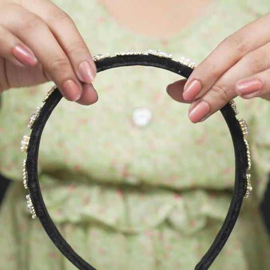 - This hairband radiates an air of royalty with its deep black hue and stunning gemstone detailing. This refined hairband adds a touch of royalty to your look, making it the perfect choice for special occasions or when you want to elevate your style with regal charm.