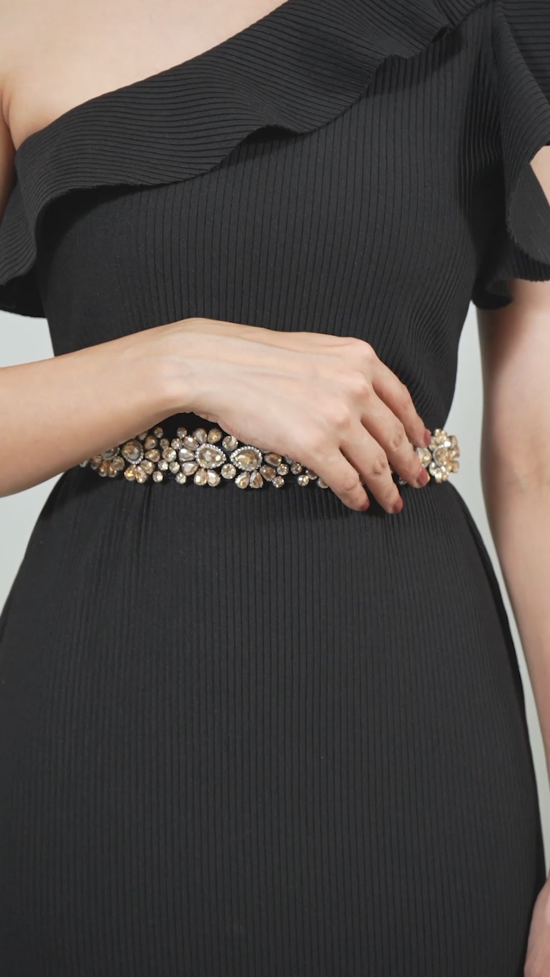 The "Gemstone Studded Belt" is a striking accessory that combines style and sophistication. This meticulously crafted belt is adorned with exquisite gemstone detailing, adding a touch of sass to your outfit. Whether you're dressing up for a special occasion, this belt is the perfect choice for a touch of luxury