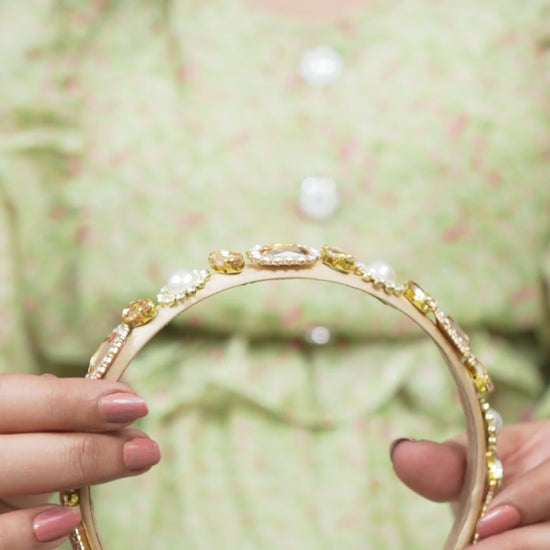 - Elevate your style with our "Golden Embellished Hairband." This luxurious accessory is expertly crafted with intricate golden embellishments, radiating a captivating charm.