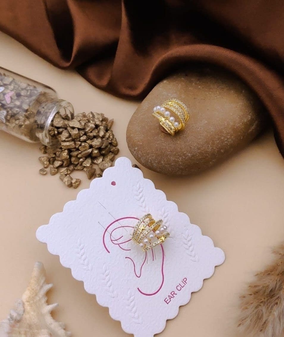 - Pearl crystal ear cuff clip is designed to add a modern and sophisticated touch to your jewelry collection. Crafted with a beautiful gold-tone finish, the ear cuff features delicate rows of sparkling crystals combined with classic pearl accents that create a graceful and eye-catching design.