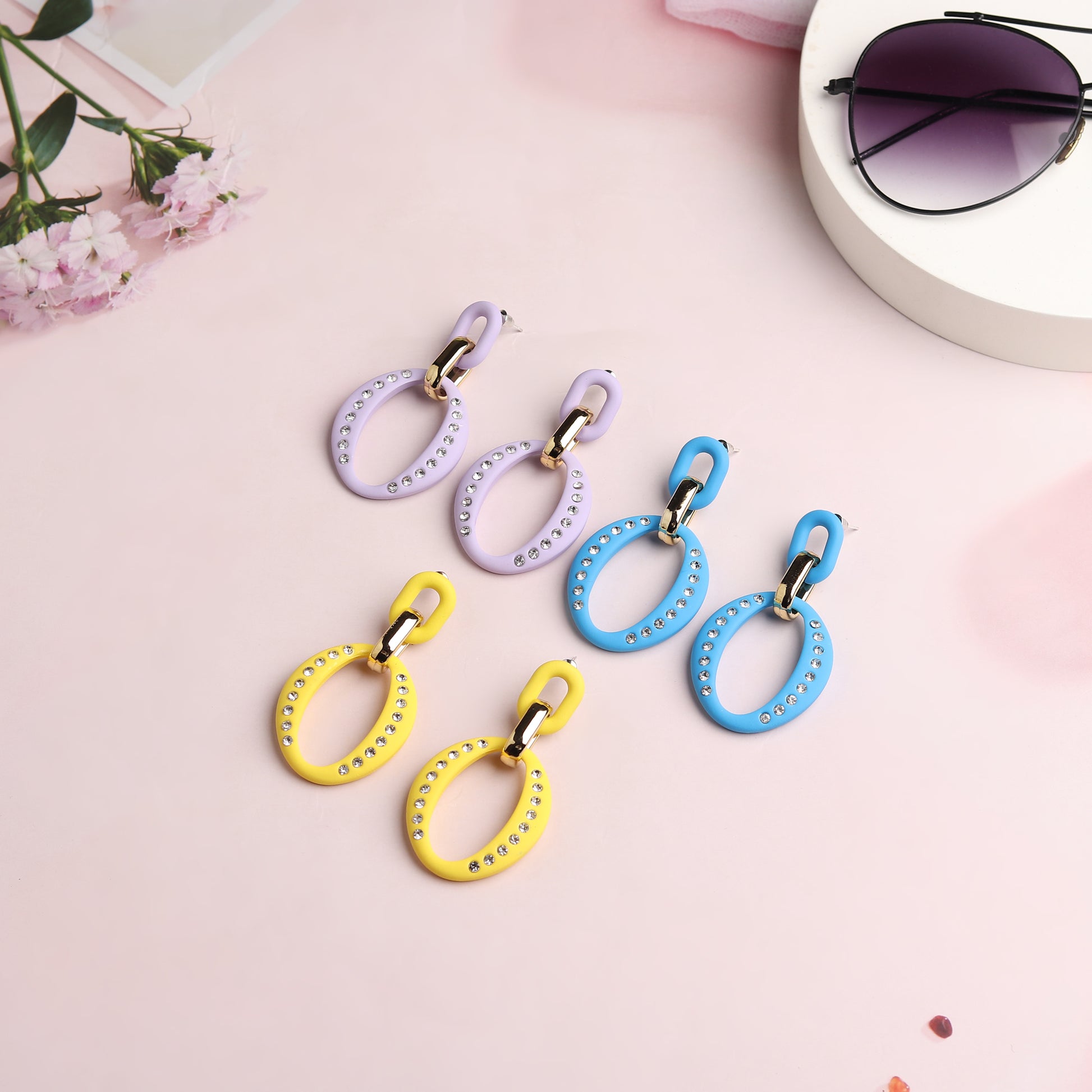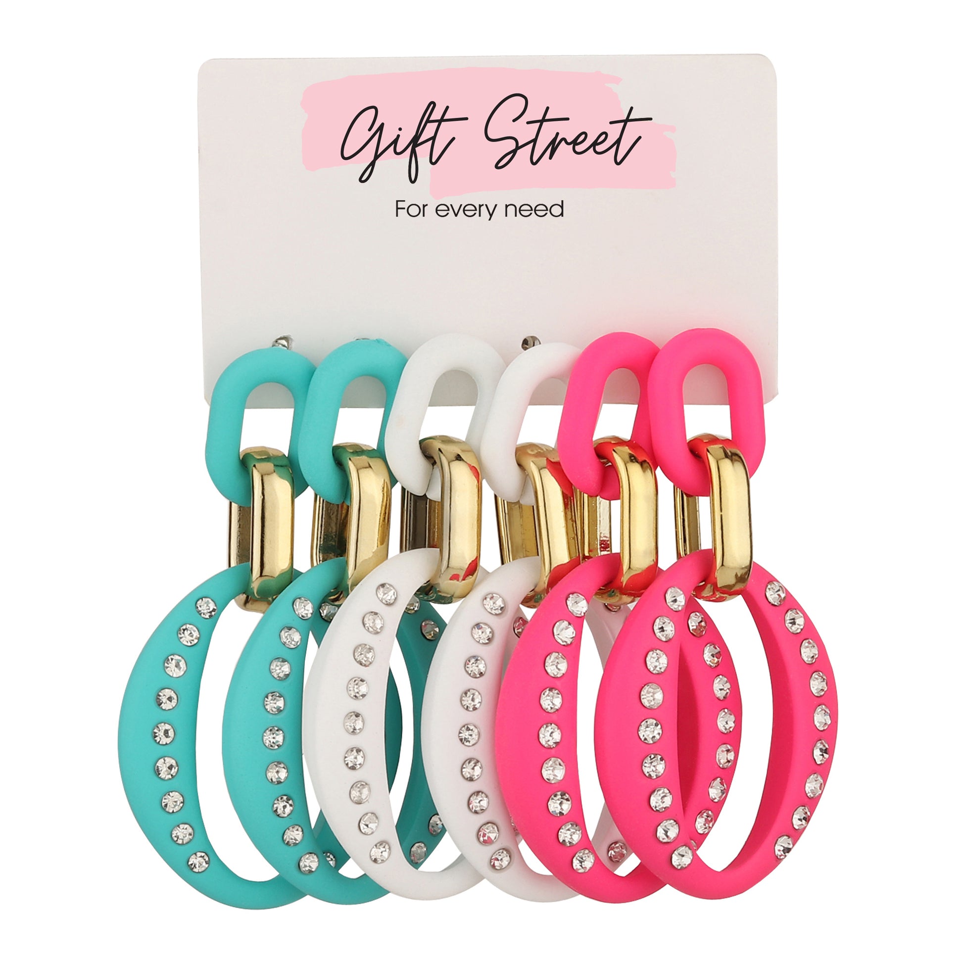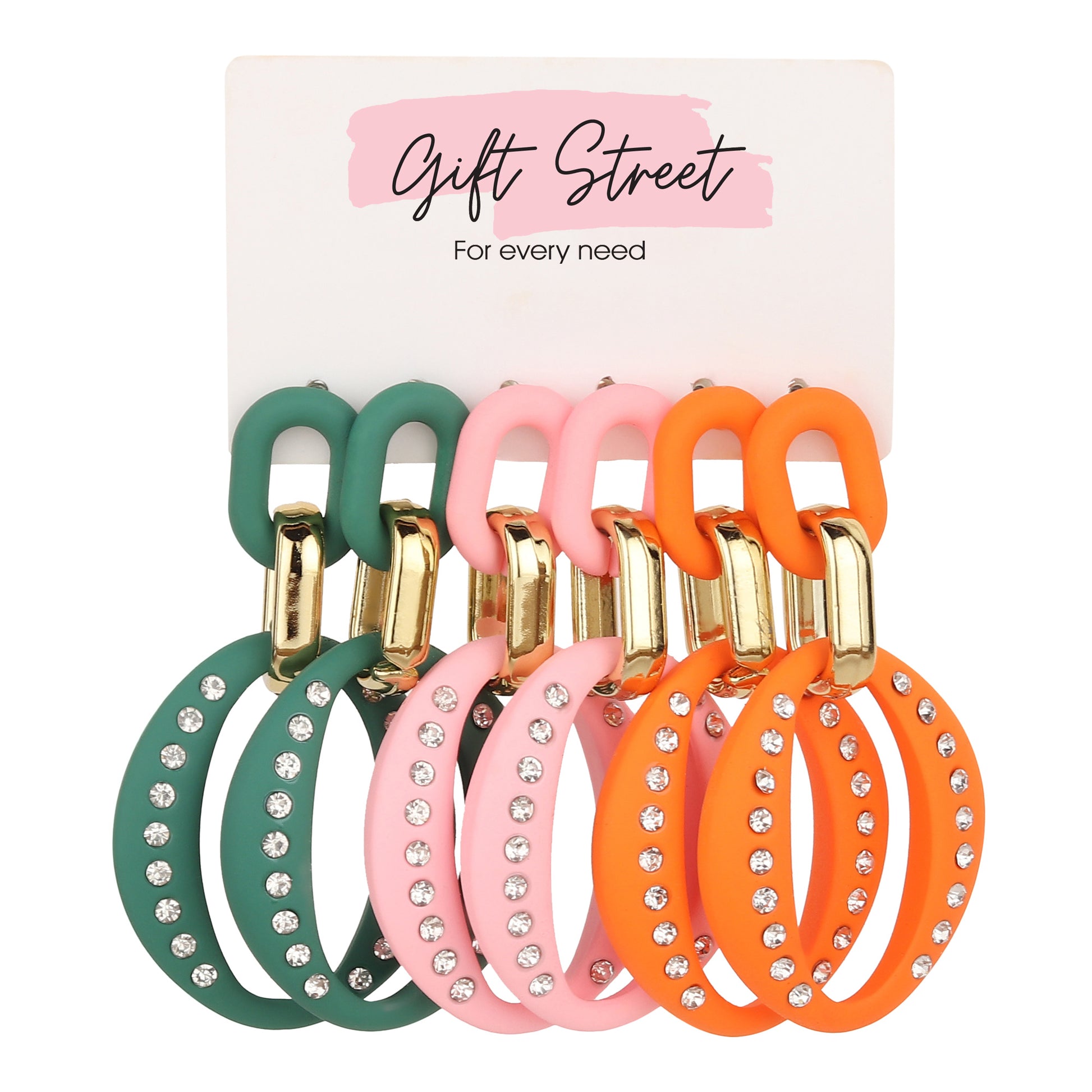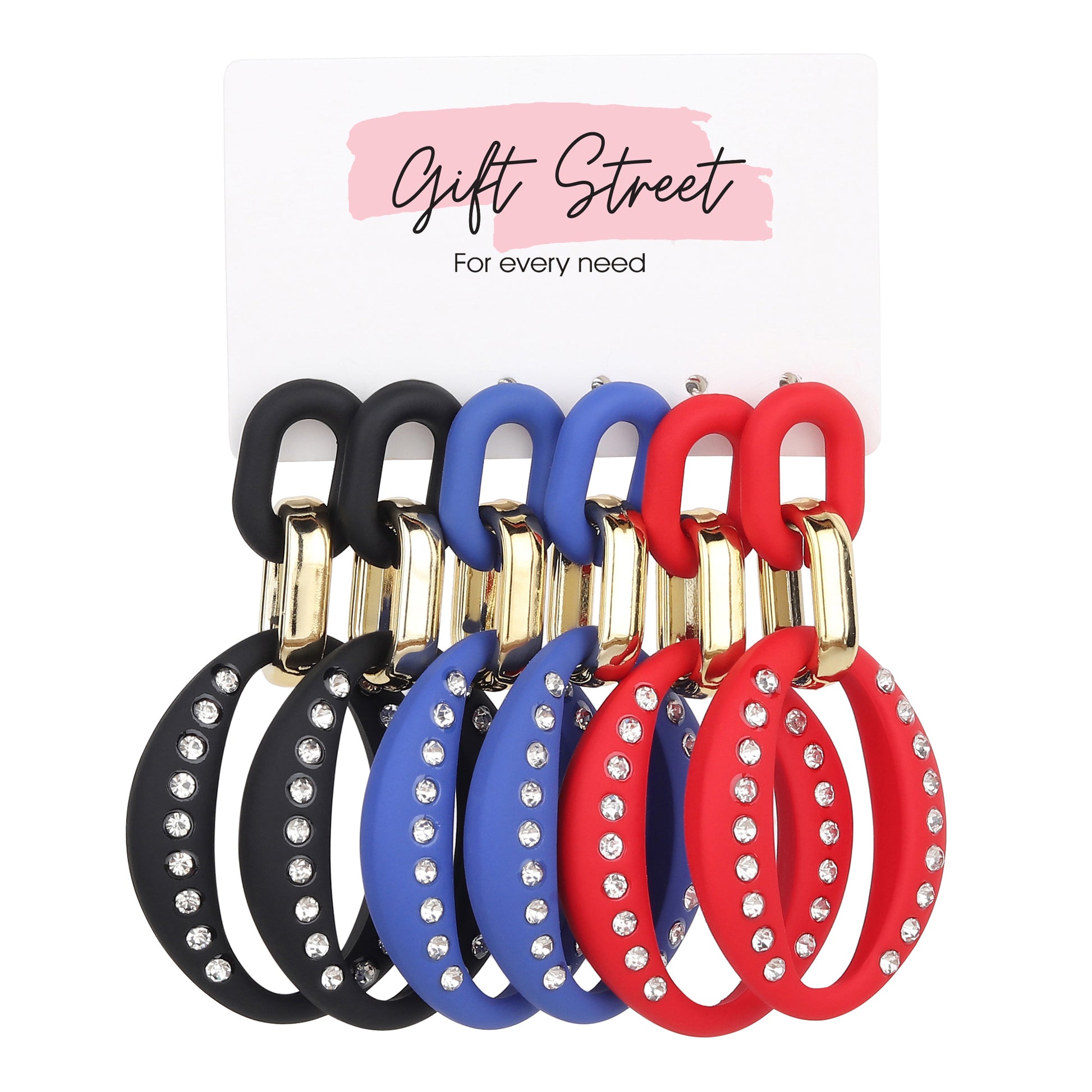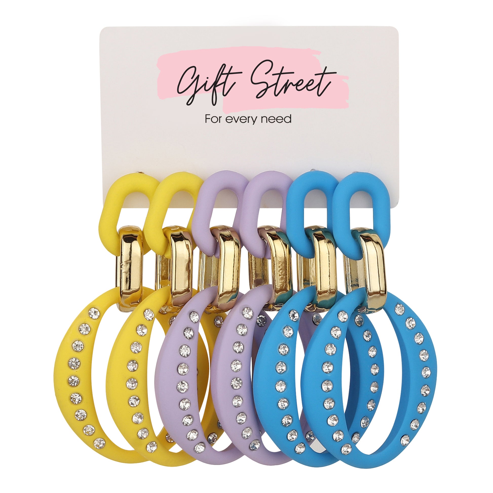 captivating earrings feature dangling circles adorned with sparkling stones, creating a mesmerizing display of elegance and glamour, perfect for elevating your style and basic outfit. - Contains 1 Set of 3 Pairs of Earrings.