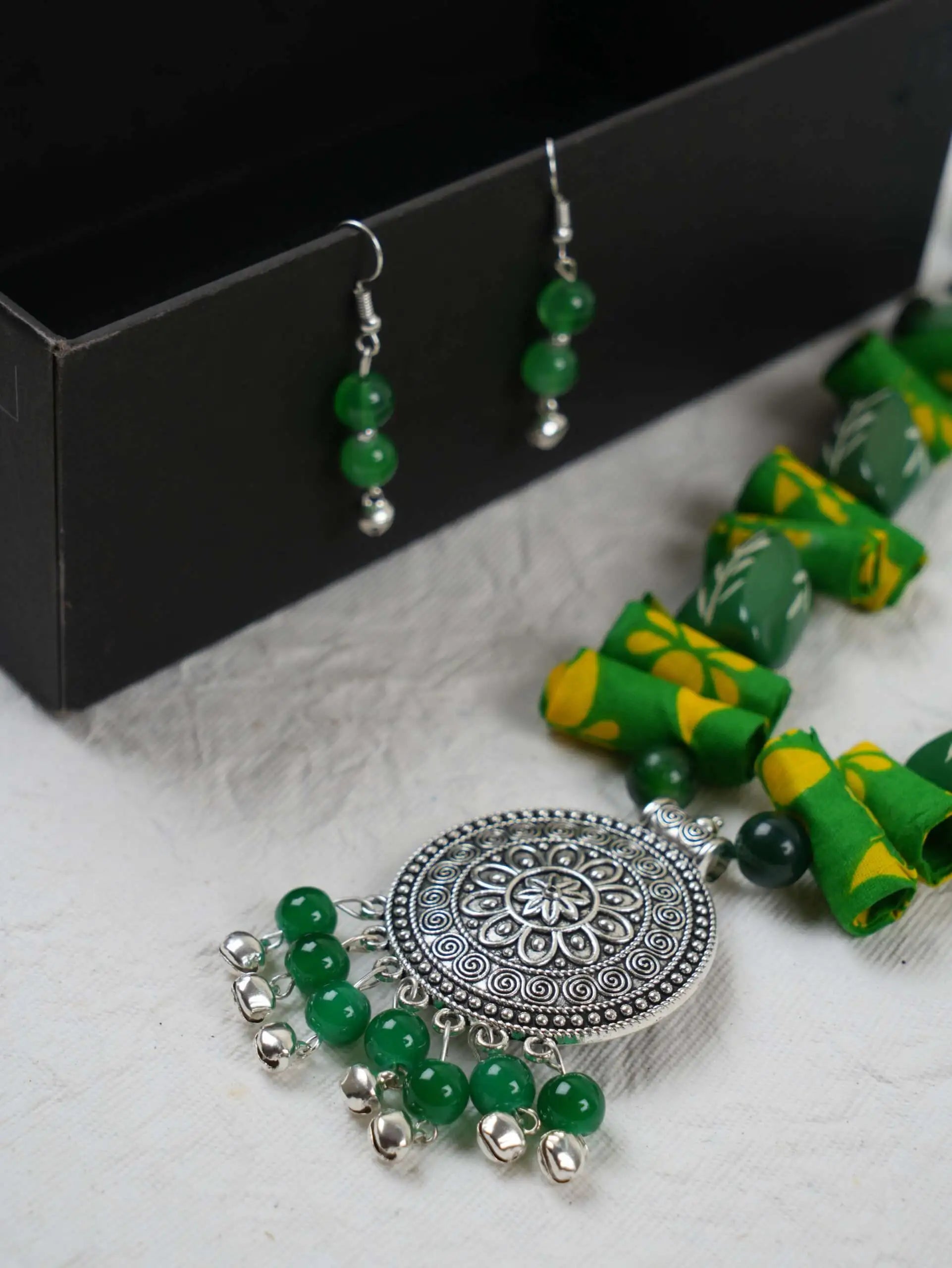 - Ā German Silver Hand made Beautiful Fabric Jewellery set of neck piece and a pair of Matching Earrings